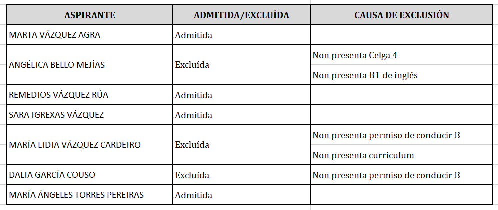 «Esgotado o prazo de admisión das solicitudes, procederase á comprobación da documentación presentada e á elaboración e publicación dun listado provisional de aspirantes admitidos e a relación das persoas excluídas e a causa da exclusión.
